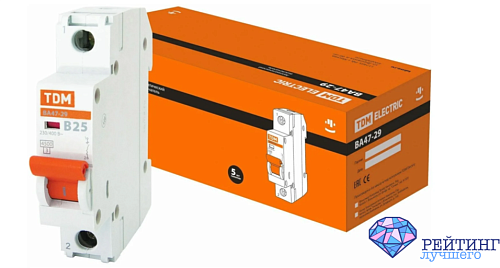 Начнем наш рейтинг с самого простого варианта от фирмы TDM ELECTRIC. Однополюсной автомат для покупки доступен в различных вариантах номинального тока, который он способен пропускать длительное время без отключения цепи: 1, 2, 3, 6, 8, 10, 13, 16, 25, 40 и 63 А. Отключающая способность при сохранении рабочего состояния составляет 4,5 кА. Напряжение сети, в которую его можно установить 220 или 380 В, при этом оно может быть переменным (АС). Расцепление типа В означает, что отключение произойдет при превышении значения в цепи более чем в три – пять раз в сравнении с номинальным. Монтаж осуществляется на DIN – рейку, есть возможность опломбирования, клеммы промаркированы и подписаны, подводить к ним можно как сверху, так и снизу, можно подключать в бытовую сеть с замоноличенной проводкой из алюминия, если таковая установлена в квартире. Прибор имеет класс защиты IP20, что означает защищенность от твердых частиц размерами более пятидесяти микрон и отсутствие влагозащиты. Маркировка не стирается и нанесена по правилам ГОСТ. Этот автомат хорошо подойдет для электроприборов и освещения, корпус его изготовлен из пластика, который не поддерживает горение. Модуль шириной 17,5 мм, на передней стенке имеет эргономичный рубильник, показывающий состояние контактов: включено – выключено. При этом сами контакты имеют насечки, предотвращающие перегрев и оплавление, а также серебряные вставки, увеличивающие срок службы и уменьшающие переходное сопротивление. Покупатели оставляют положительные отзывы о товаре. Хвалят его за качество, крепкую рукоятку и соединения. Отмечают трудность демонтажа, и что установку нужно производить специалисту строго по проекту электропроводки и затягивать контактные группы с рассчитанным моментом затяжки.