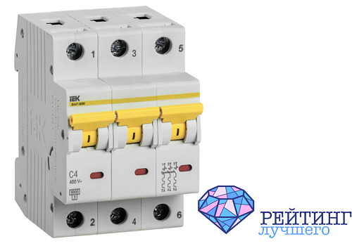 Мы не могли не указать в нашем рейтинге многомодульные автоматы. Производитель IEK выпускает трехполюсной и трехфазный выключатель ВА 47-60 3P (C) 6kA. Значения номинального тока: 4, 6, 10, 16, 40, 50 и 63 А. Расцепление по типу С означает, что срабатывание размыкания цепи произойдет при превышении значений в пять – десять раз. Такой тип используется для маломощного оборудования, которое мы как раз используем в быту. Отключающая способность при коротком замыкании составляет 6 000 А.