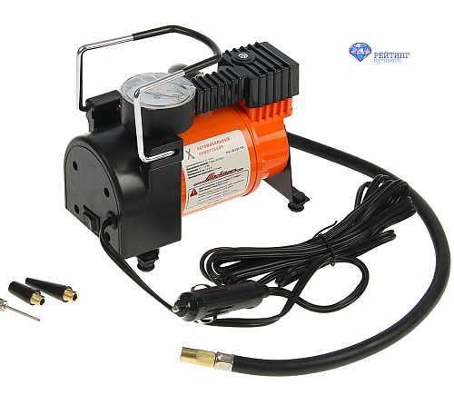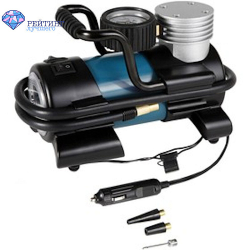 Простой и удобный в использовании компрессор обладает всеми необходимыми характеристиками, чтобы находиться в нашей подборке. Он достаточно компактный, не займет много места. В комплекте поставки предусмотрена сумка для транспортировки и хранения инструмента. Справляется со своими задачами на ура, отличается долговечностью и качественными материалами исполнения. Пользователи отмечают то, что насос качает колеса очень быстро, также мы выделяем его относительно тихую работу. В комплект входят три насадки, а плотный провод и качественный штекер с предохранителем оценят истинные ценители и мастера своего дела. Невысокая цена компрессора и небольшие компактные размеры – это то, за что пользователи выбирают данную позицию из нашего рейтинга. Хорошая богатая комплектация и качественная сборка – это тоже достоинства, на которые нельзя не обратить внимания.