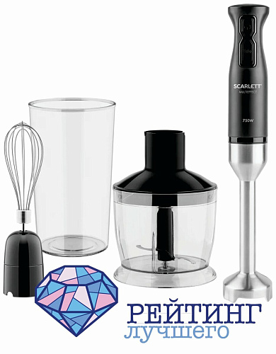 Бренд Scarlett имеет в своей линейке кухонных приборов погружной блендер SC-HB42F52. Это целый комплект для работы на кухне. Здесь есть чаша с горизонтальными ножами, в которой удобно измельчать продукты. Венчик для взбивания пригодится при готовке десертов. Стандартная насадка измельчителя наделена лезвиями по технологии Multi Effect. Вертикальные лезвия укорочены для повышения режущей силы ножа, что делает его экспертом по твердым ингредиентам. Сталь марки Steel Pro, из которой сделаны все рабочие части насадок, позволяет работать с холодными и горячими, твердыми и вязкими продуктами – ей не страшны любая температура и консистенция. Оптимальная мощность для рубки, взбивания и смешения, равная 750 Вт. Кроме того, в комплект входит стакан из пластика, который можно применять и как посуду для готовки, и как емкость для работы блендером. Импульсное управление осуществляется механическим нажатием на кнопку запуска на рукоятке. Также рядом располагается и кнопка, запускающая режим Turbo, который рекомендован в конце обработки на пятнадцать – тридцать секунд для получения однородной массы без комочков. Вместимость чаши и стакана составляет шестьсот миллилитров. Шнур питания длиной чуть более одного метра позволит удобно расположиться на рабочей поверхности недалеко от розетки. Диаметр рукоятки всего пять сантиметров, а высота тридцать семь. Покупатели оставляют положительные отзывы о товаре. Хвалят его за отличную работу, легкую сборку и мытье, комплектацию. Отмечают, что немного шумноват, однако при длительной работе не нагревается.