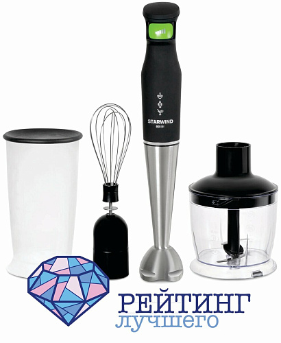 Полный комплект для выполнения любой кулинарной задачи на кухне представлен в модели SBS2212W бренда STARWIND. Здесь вы получаете стандартную погружную насадку для измельчения, которая позволит сделать суп-пюре, пюрировать любое блюдо или расколоть лед. Чаша для измельчения с встроенными лезвиями удобна для быстрой рубки овощей или мяса. Из нее удобно переложить все в посуду для дальнейшей готовки. Венчик подойдет для любителей готовить десерты: взбить крем или смешать до однородности составляющие. Кроме этих комплектующих, имеется и мерный стакан с крышкой, где можно будет хранить приготовленный смузи или охладить его в холодильнике. Низкий уровень шума отличает эту модель, ведь большинство блендеров работают достаточно шумно. Максимальная мощность составляет восемьсот ватт, которых вполне хватит для выполнения стандартных кухонных задач. Скорость вращения рабочих частей регулируется плавно на рукоятке, поэтому вы легко сможете перейти от минимального значения к максимальному, что важно, например, при взбивании яиц для безе или меренги. Отметим, что все погружные части изготовлены из металла, разрешенного к применению с пищевыми продуктами. Покупатели высоко оценили товар и не упомянули ни одного недостатка.
