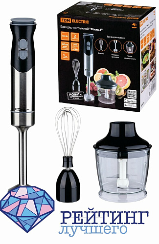 Комплект насадок и блендера представлен в наборе "Микс 3" бренда TDM ELECTRIC. Здесь, как и в предыдущих вариантах, имеются несколько насадок для выполнения кулинарных задач любой сложности. Тут есть и венчик для взбивания кремов или пышного безе, и стандартный блендер для измельчения непосредственно в посуде: хоть в кастрюле, хоть в салатнице, и чаша-измельчитель с встроенными ножами, в которой удобно порубить мясо или порезать овощи для дальнейшей готовки. Все рабочий части сделаны из нержавеющей стали, поэтому они прослужат длительное время и не впитают в себя запахи и вещества от используемых ингредиентов. Мощность составляет семьсот ватт, что довольно большое значение для ручного погружного блендера. Такая мощность обеспечивает максимальное значение одного из режимов скоростей вращения лезвий до шестнадцати тысяч оборотов в минуту. Управление происходит механически за счет кнопок на рукоятке. Длина шнура питания равна восьмидесяти сантиметрам, что обеспечивает безопасное и удобное размещение на рабочей поверхности. Также к преимуществам можно отнести и тихую работу прибора. Диаметр рукоятки равен 6,4 сантиметра, а высота 38,5, при этом ее вес не превышает один килограмм. Покупатели высоко оценили товар и не отметили ни одного недостатка.