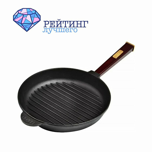 - Гриль. Посуда узконаправленной специфики, отличительная особенность которой ребристое дно. Оно минимизирует проникновение масла в ингредиенты. При этом компоненты быстро обжариваются, образуя корочку, под которой сохраняются все полезные свойства и соки. То есть мясные или рыбные деликатесы остаются сочными, при этом приготовленные в любой степени прожарки. Бывает квадратной и круглой формы. Иногда со специальным желобом для отвода лишней жидкости и масла. Благодаря оптимальной толщине, приготовление не занимает много времени, а после - еще долго остается теплой. В качестве крышки используется специальный пресс.