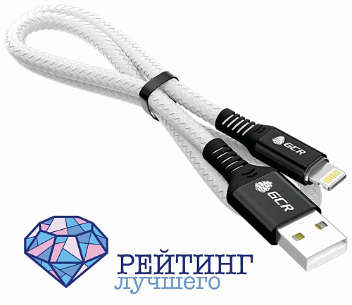 Бренд из России GCR основан в 2013 году и сначала занимался поставками комплектующих других брендов. В 2015 году был произведен запуск собственного производства для российского корпоративного рынка, увеличение производственных мощностей которого происходит до сих пор. Шнурок имеет нейлоновую оплетку белого цвета, повышающую гибкость провода и усиливающей прочность на разрыв, а в местах соединения с разъемами специальные защитные изоляционные колпачки от заломов и перегибов. Подключение к адаптеру питания или ПК для синхронизации и передачи данных осуществляется через USB, на который нанесена гравировка логотипа. Сердечник выполнен из меди, а металлические коннекторы защищают его от механических повреждений. Длина аксессуара равна 1,2 метра, совместимость с устройствами на IOS от 11 до 15 версии из – за встроенного чипа 75 MFi. Обеспечивает скорость передачи данных до 480 Мбит/с, а значение силы тока при подзарядке до 2,4 А. Покупатели оставляют положительные отзывы о товаре, отмечая быструю зарядку и приятное оформление.