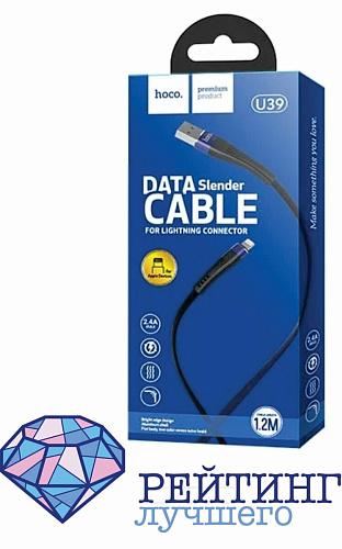Этот аксессуар мы включили в наш рейтинг за его повышенную гибкость. Бренд Hoco основан в 2009 году в Китае, и сейчас распространен более чем в пятидесяти странах. Основная цель при производстве продукции – качество в сочетании с простотой, практичностью, яркостью и стилем. Шнур длиной 1,2 метра плоской конструкции U39 Slender Lightning доступен для покупки в трех цветах: черно – золотой, сине – черный и красно – черный. Тканевая оплетка из нейлона позволяет сгибать шнур без последствий. Внутри располагается медный провод, обеспечивающий проводимость тока силой 2,4 А. USB – разъем из алюминиевого сплава с лазерной гравировкой логотипа позволит подключать устройства на IOS к адаптеру питания и компьютеру для зарядки или синхронизации с передачей данных. Покупатели оставляют положительные отзывы о товаре. Отмечают отличную работоспособность, цену, долгий срок службы и отсутствие деформаций по всей длине.