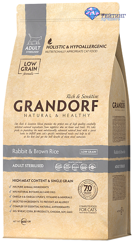2. Лучший корм от проверенного производителя – Grandorf Rabbit & Brown Rice Sterilised гипоаллергенный.