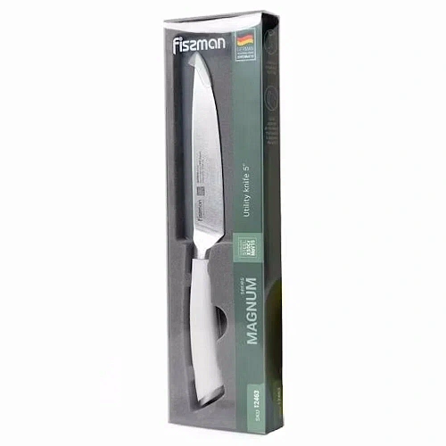 Нож серии MAGNUM — словно швейцарский нож в мире кухонных инструментов: универсальный, собранный с немецкой педантичностью и готовый к любым кулинарным вызовам. Лезвие из стали X50CrMoV15 (HRC 57) с двусторонней симметричной лазерной заточкой режет гладко, как конькобежец скользит по зеркальному льду — без усилий, без запинок. Больстер из нержавеющей стали работает незаметно, как опытный дирижёр: распределяет нагрузку, добавляет ножу стабильности и не даёт руке соскользнуть на лезвие. Рукоятка из АБС‑пластика без заклёпок сидит в ладони удобно, словно влитая, — никаких выступающих деталей, никаких «сюрпризов», только чистый комфорт и гигиеничность. С ним и рыбу разделать, и овощи нашинковать, и мясо нарезать — всё по плечу этому работяге.