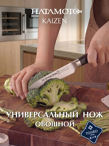Нож Hatamoto Kaizen (HVT‑020) — словно миниатюрный самурай на кухне: маленький, но удаленький, с острым нравом и безупречной выправкой. Лезвие из японской стали AUS‑8 с финишной заточкой 8000 грит режет гладко, как лёд под коньком — будто продукты сами расступаются перед его безупречной остротой. При длине всего 9,7 см он ловко пробирается в самые укромные уголки: идеально чистит клубни, филигранно нарезает клубнику «веером», аккуратно удаляет глазки у картофеля и хвостики у перца. Рукоять из термопласта лежит в руке надёжно, словно тёплый камешек, согретый солнцем, — не скользит даже во влажной ладони и стойко переносит и жару, и холод (от −40 ∘C до 150 ∘C).