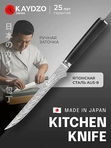 Обвалочный нож KAYDZO Matsue AUS‑8 (KM‑1700) — словно верный самурайский помощник, рождённый в сердце японской кузнечной традиции: он готов взяться за самые непростые задачи по разделке мяса. Лезвие из стали AUS‑8 с твёрдостью HRC 58 и толщиной 2 мм — это крепкий орешек, который не боится коррозии и долго держит заточку. При длине лезвия 15 см и общей длине 28 см нож удачно балансирует между компактностью и функциональностью: им удобно маневрировать, будто управляя ловкой яхтой в узких проливах. Лёгкая рукоятка надёжно лежит в ладони — не выскальзывает, не утомляет, позволяя часами филигранно отделять мясо от костей без лишней суеты.