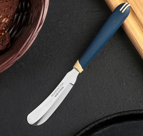 Нож для масла Multicolor от TRAMONTINA — словно весёлый акцент на кухне: синий, компактный и такой лёгкий (18 г), что кажется, будто он порхает над тарелкой, как бабочка. При длине лезвия всего 7,5 см и общей длине 18 см он будто создан для того, чтобы раскрасить серые будни — намазать масло на хлеб, украсить бутерброд каплей джема или аккуратно распределить крем на мини‑тортике. Лезвие из стали AISI 420 работает мягко, как поглаживание, — не рвёт хлеб, а деликатно намазывает, будто знает секрет идеального завтрака. Полипропиленовая ручка сидит в руке удобно, словно игрушечный меч в ладони ребёнка, — не скользит, не утомляет, да ещё и цвет радует глаз.