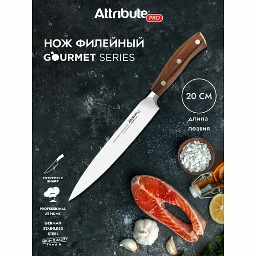Филейный нож ATTRIBUTE «GOURMET» длиной 20 см — словно скальпель в руках кулинарного виртуоза: с ним разделывать мясо и рыбу — одно удовольствие. Сталь немецкого происхождения (Din 1.4116) с твёрдостью HRC 55±2 и толщина лезвия в 2,0 см работают в тандеме, чтобы каждый срез получался лаконичным, как строчка в поэме. Рукоятка из натурального орехового дерева лежит в руке так удобно, будто была создана по индивидуальному слепку ладони. Визуально нож тоже не подкачал: серебристое лезвие и коричневая рукоять смотрятся гармонично, как дуэт опытного шеф‑повара и его верного помощника. А ещё его можно смело отправлять в посудомоечную машину — и это заметно снимает груз забот с плеч хозяйки.
