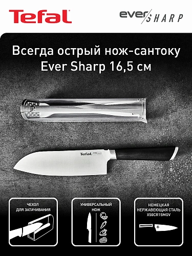 Tefal Ever Sharp Santoku Knife (16,5 см, модель K2579024) — словно меч легендарного героя, который никогда не тупится: этот сантоку будто знает секрет вечной остроты. Секрет, впрочем, не мистический, а вполне технологичный: чехол с запатентованной точилкой затачивает лезвие до и после каждого использования — нож освежает свой нрав, будто по волшебству. Представьте: вы берёте его за ручку — система блокировки легко снимается, а безопасные выступы стоят на страже, оберегая пальцы от случайных встреч с лезвием. Лезвие из немецкой нержавеющей стали длиной 16,5 см режет так чисто, что овощи и мясо рассыпаются аккуратными ломтиками, едва почувствовав прикосновение. А прозрачный чехол и стильная гарда из стали делают нож украшением кухни — он не прячется в ящике, а гордо занимает место на столешнице.