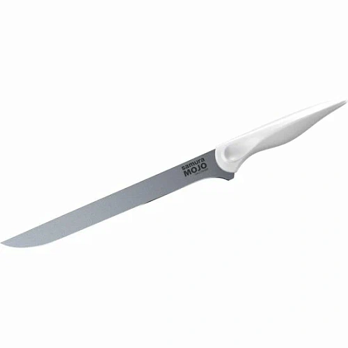 Нож филейный Samura MOJO — словно скальпель в руках кулинарного хирурга: точный, ловкий и беспощадно острый. При длине лезвия 218 мм (21,8 см) и общей длине 338 мм (33,8 см) он проникает в суть продукта, отделяя мякоть от костей с ювелирной аккуратностью — ни грамма лишнего не останется на костях, хрящах или сухожилиях. Сталь AUS‑8 с твёрдостью HRC 58 и двусторонней заточкой #3000 режет остро, как утренний иней, а угол заточки 15–17∘ позволяет делать тонкие, почти прозрачные ломтики рыбы или мяса — будто вы не режете, а рисуете тонкими линиями на гастрономическом холсте. Белая полипропиленовая рукоять (120 мм) лежит в руке удобно, словно ручка любимой авторучки, — не скользит, не утомляет, а лёгкий вес в 82 г делает работу почти невесомой.