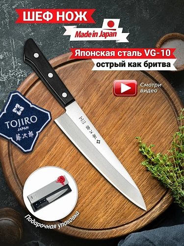 Нож шеф Tojiro — словно мудрый сэнсэй на вашей кухне: японский характер, отточенный веками мастерства, сочетается с современной силой стали VG‑10. Трёхслойное лезвие длиной 20 см режет остро, как взгляд мастера боевых искусств — точно, уверенно, без лишних движений. Оно будто знает, что от него ждут: и мясо нарежет, и рыбу разделает, и овощи нашинкует с лёгкостью взмаха веера. Деревянная рукоять лежит в руке уютно, словно старинная книга в руках библиофила, — натуральный материал даёт надёжный хват и добавляет ножу благородства. Этот инструмент не просто режет — он ведёт диалог с продуктами, подчёркивая уважение к кулинарному процессу.