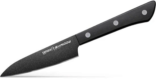 Нож Samura Shadow для овощей — словно скрытный ниндзя кухонного фронта: чёрный, стильный, с гравировкой, будто татуировкой боевого мастера. Лезвие длиной 99 мм из японской стали AUS‑8 с покрытием Black Fuso работает бесшумно и ловко — продукты не липнут к шероховатой поверхности, словно боятся задержаться на пути у этого тёмного виртуоза. Заточка на водных камнях зернистостью 5000 грит до твёрдости HRC 58 даёт рез чёткий, как приказ командира: нож долго не тупится и готов к подвигам — от нарезки помидоров до шинковки лука без слёз (ну, почти). Рукоятка из ABS‑пластика в тон лезвию лежит в руке надёжно, как верный амулет, — не скользит даже во влажной ладони, не собирает бактерий и не выдаёт своих секретов выступом или зазором.