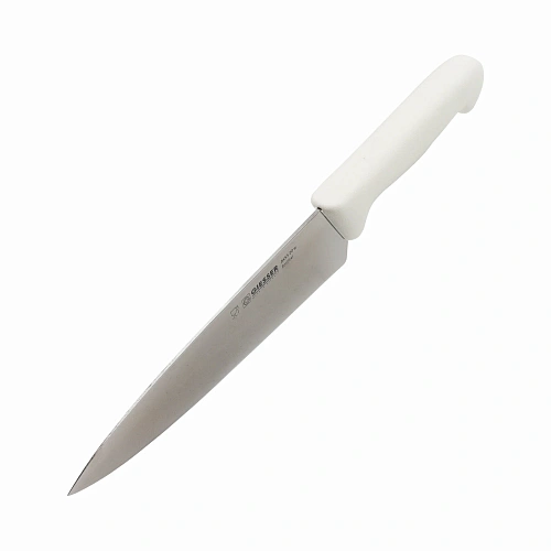 Шеф‑нож Giesser с лезвием 20 см — словно надёжный напарник в кулинарных сражениях: мощный, но послушный, он берётся за дело с немецкой педантичностью. Хромомолибденованадиевая сталь (HRC 56) режет уверенно, как уверенный шаг марширующего солдата — без рывков и запинок. С ним и мясо поддаётся легко, и рыба разделывается в два счёта, а овощи шинкуются ровно, как строчки в аккуратно напечатанном тексте. Рукоятка из термоэластопласта сидит в ладони удобно, словно любимая перчатка: не скользит, смягчает нагрузку и не заставляет руку уставать даже после долгой нарезки. Отличная геометрия и продуманный баланс делают этот нож ловким продолжением руки — будто он заранее угадывает, какой ломтик вам нужен.