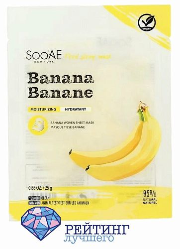 Тканевая маска SOOAE Banana Banane не содержит продуктов животного происхождения, поэтому может использоваться веганами. Кроме того, она не проходила испытания на животных. Упаковка оформлена в ярких желтых тонах, которые сразу привлекут внимание. После применения SOOAE Banana Banane, вы получите напитанную кожу и ее ровный тон, излучающий естественное сияние. Вещества, входящие в SOOAE Banana Banane, оказывают увлажняющее, омолаживающее, питающее, разглаживающее морщинки действие, делают кожные покровы упругими. Состав на девяносто пять процентов представлен натуральными компонентами.
