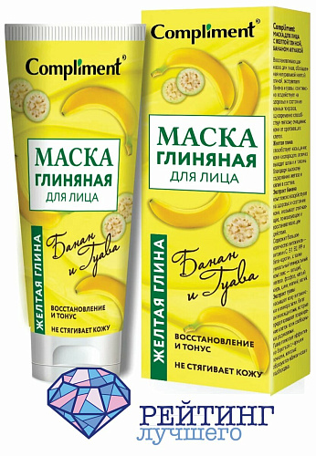 Желтый тюбик с 80 миллилитрами маски Compliment Банан и Гуава содержит вытяжки экзотических плодов: банана и гуавы. Основу ее представляет желтая глина, которая насыщает кислородом кожные покровы, а за счет своих сорбирующих свойств, выводит из них шлаки и токсины. Банановая эссенция смягчает и тонизирует, восстанавливает тон лица, а вытяжка из гуавы содержит большое количество антиоксидантов, которые образуют защитные механизмы от свободных радикалов. Вместе эти компоненты насыщают кожу витаминами и минералами: железом, калием, кальцием, фосфором, натрием, цинком, магнием, медью, витамином С, В1, В2, РР и бета - каротином.