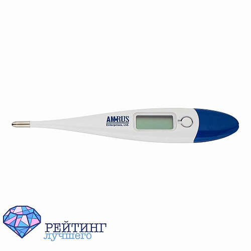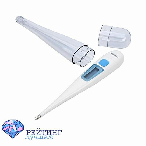 Электронный термометр с диапазоном температур от 32 до 44 градусов. Можно использовать в подмышечной (длительность измерения составит 5-10 минут), оральной и ректальной зонах (по 1 каждая). Обладает следующим функционалом: звуковой сигнал, автоотключение, память рассчитана на запоминание 1 последнего показания. Если верить отзывам, батареи у этой модели хватит на 5-6 лет. После разрядки батарейку можно будет поменять. Указанная в характеристиках погрешность составляет 0.1 градус, однако в отзывах есть люди, рассказывающие о более значительных отклонениях.