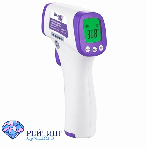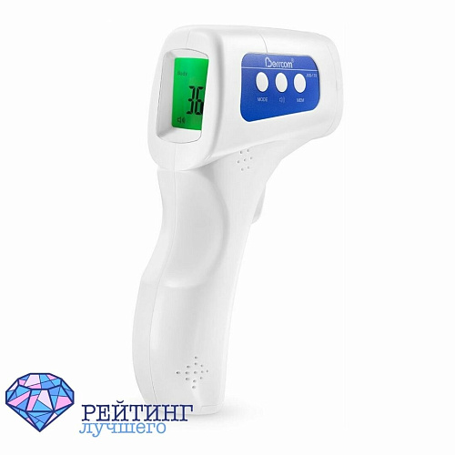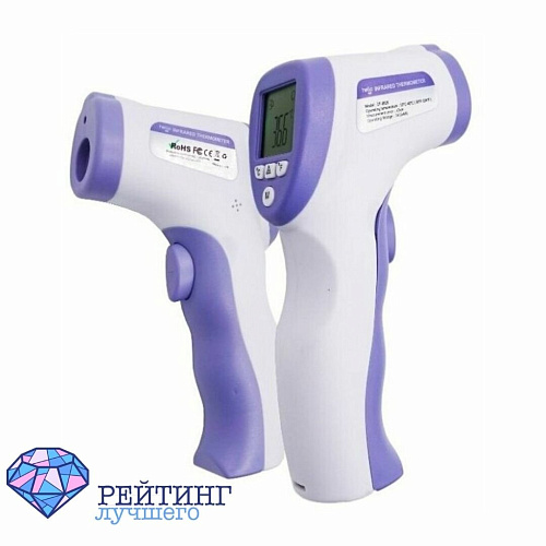 Бесконтактный электронный термометр, измеряет область лба. При покупке в комплекте идет инструкция по применения на русском языке и две батарейки типа АА. Производитель уверяет, что устройство способно сделать до 5 000 измерений на одной паре батареек, а точность этого самого процесса гарантирует ИК-датчик. При повышенной температуре у больного термометр издает специальный сигнал. Дисплей устройства оснащен подсветкой. Время. Необходимое термометру на замер составляет 0.5 секунды. Благодаря этой модели Вы можете измерить температуру спящего человека, не потревожив его, а еще узнать, сколько градусов в Вашей еде, набранной ванне или, например, холодильнике.