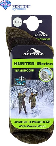 Термоноски Hunter Merino от производителя Alpika изготовлены из шерсти австралийских мериносов. Они знамениты на весь мир, и их уникальность позволяет добиться наилучшего комфорта и сохранения ног в тепле при очень низких температурах зимой. Во внутренний слой, где содержится шерсть, наилучшим образом впитывается влага, что, с учетом ее свойств, позволяет сохранять ноги теплыми. А внешний слой из нейлона придает повышенную прочность изделию. Использование производителем трёхслойной махровой вязки позволило обеспечить износостойкость и лучшую циркуляцию воздуха. Помимо этого, применение эластичного бандажа стопы и голеностопа дает надежную фиксацию на ноге, что принесет максимум комфорта и удобства в повседневной эксплуатации. Помимо этого, были усилены части, которые подвержены наибольшей нагрузки (носок, пятка), что позволяет смягчить удары во время ходьбы и предотвратить потертости. Данные носки рекомендованы для использования в рамках зимних прогулок на природе, по городу, а также тем, кто занимается охотой и рыбалкой.