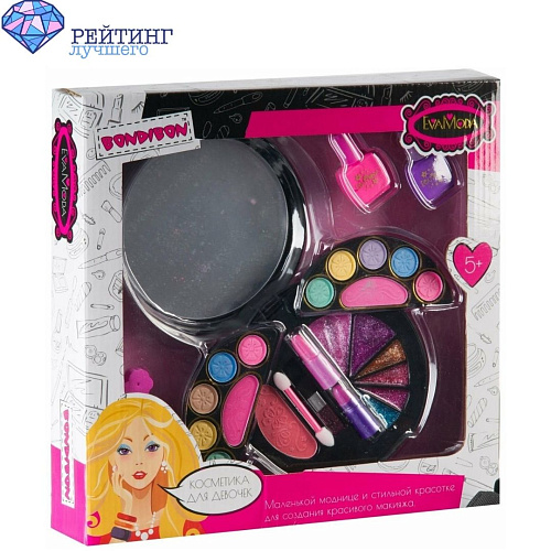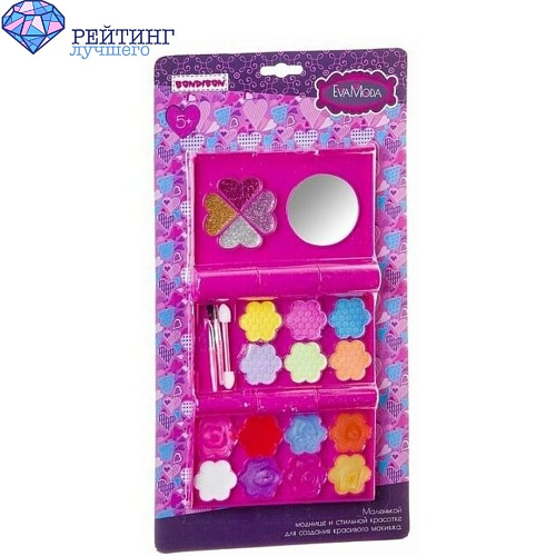 Небольшой набор бренда BONDIBON, который упоминался ранее, имеет в составе целых 11 оттенков теней разных цветов, блеск и помаду для губ, лак для ногтей и три заколки, которые станут приятным бонусом к косметике. Всё это помещено в двухуровневую шкатулку розового цвета с «зеркальцем» - отражающей плёнкой. Набор содержит только один аппликатор, которого может не хватить для нанесения макияжа – они легко загрязняются и теряются. В целом, этот вариант может считаться наиболее удачным по соотношению цены и качества.