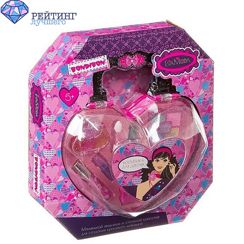 Отличием этого набора от других становится сумочка-косметичка в виде сердца, которая привлечёт к себе внимание. В косметичке содержится несколько разных продуктов – тени, помада, блески и лаки для ногтей. Данный бренд встречается в рейтинге не первый раз, их косметика отличного качества и хорошо смывается водой. Отлично подходит в качестве подарка ребёнку из-за яркого дизайна и разнообразия цветов.
