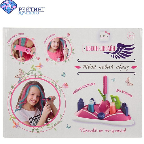 В сфере красоты давно играют важную роль косметика для волос, поэтому в рейтинге без них не обойтись. Бренд Lukky предлагает набор для покраски и завивки волос. В наборе – краска для волос двух цветов, губки для нанесения краски и устройства для гофрирования и завивки волос. Продукты безопасны и легко смываются, подходят детям от шести лет. Безопасны и подходят для самостоятельного пользования. Вариант интересен и наличием специальной подставки, позволяющей держать все элементы вместе.