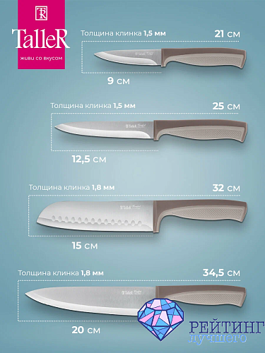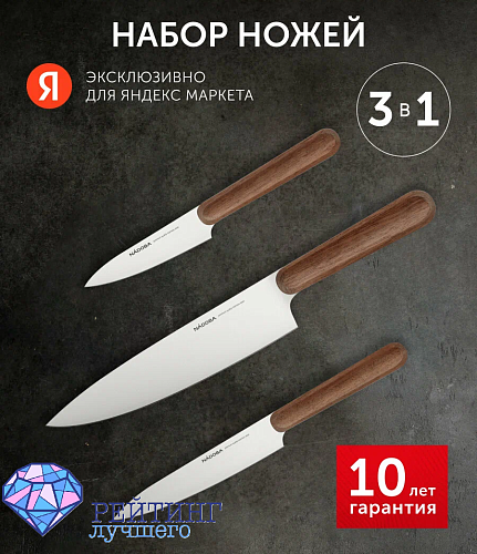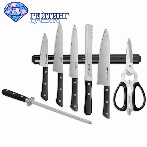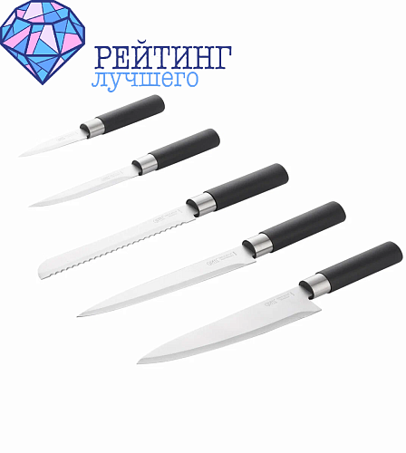 3, в наборах подороже может быть 5 или 6. В наиболее распространенных наборах кухонных ножей присутствуют универсальный, разделочный или овощной и шеф. В расширенные комплектации ножей добавляются филейный, хлебный, сантоку и топорик.