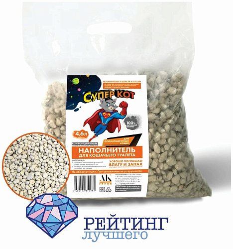 Бренд супер Кот имеет наполнитель для длинношерстных кошек. Сделан он из стопроцентного натурального материала, обеспечивающего комфорт пушистикам. Обладает бактерицидными свойствами. Тонкопористая структура гранул обладает хорошей поглощающей способностью влаги и запахов. Кроме того, она не образует пыли, поэтому не пачкает лапы и шерсть животного и, следовательно, поверхности в доме. При увлажнении средство не разрушается, поскольку лишено глинистых составляющих, а значит не будет разноситься по всем уголкам и забиваться в щели. Для лучшего применения рекомендуем следовать инструкции на упаковке: насыпать слой не менее пяти сантиметров и по мере его использования заменять на свежий. Наполнитель не содержит ароматизаторов и активных веществ, которые могут вызвать аллергические реакции у людей и животных. Хорошо впитывает влагу, способен поглотить до двенадцати литров при собственном объеме 4,6 л. Производитель заявляет, что одной упаковки хватит на целый месяц, при этом у него небольшая цена. Упаковка из пластика имеет вверху ручку для лучшей переноски. Покупатели оставляют положительные отзывы о товаре. Хвалят его за размеры составляющих частиц, отсутствие запаха и хорошую сорбцию влаги. Отмечают, что коты не выкидывают его из лотка, и он им нравится.