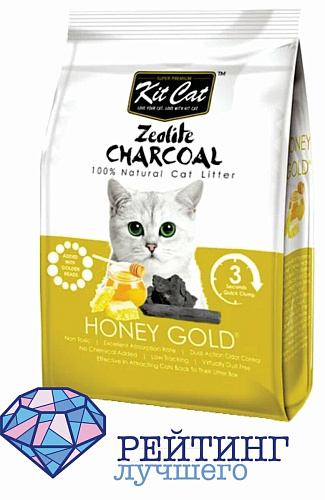Натуральные пористые минералы входят в состав наполнителя для кошачьего туалета Kit Cat Zeolite Charcoal Honey Gold. Очищенные цеолит и древесный уголь при намокании образуют комки всего за три секунды, которые легко убрать из лотка во избежание распространения запаха. Кроме того, они могут и поглощать его, ведь обладают сорбционными свойствами за счет наличия в своей структуре пор. Средство обработано медовым ароматизатором – легким и ненавязчивым. Поскольку в состав входят минеральные природные компоненты, то они не могут вызвать аллергических реакций ни у животных, ни у людей. Не содержит химикатов. Фасовка осуществляется в пластиковые пакеты весом от одного до пяти килограммов. Покупатели оставляют положительные отзывы о товаре. Хвалят его за приятный аромат, который нравится котам, хорошую впитывающую способность, растворимость в воде, что его можно смывать в канализацию.