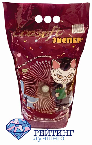 И начнем мы наш рейтинг с самого простого вида наполнителей - впитывающего минерального гранулированного Экософт эксперт 4 л. Он состоит из высококачественного сорбента на основе вулканического туфа и силикагеля, прошедшего термическую обработку. Эффективно поглощает запахи и влагу до четырех с половиной литров. Если же запах все же появился, то это свидетельствует о том, что пора сменить поглощающий слой или же добавить сто-двести граммов гранул. При использовании не разрушается, поэтому не требуется частая его замена. По этим причинам можно назвать его высокоэффективным и экономичным средством. Для покупки доступна фасовка на 2,1 килограмма в полимерной упаковке с отверстиями для пальцев для удобной переноски. Покупатели оставляют положительные отзывы о товаре. Хвалят его за хорошую впитываемость, хорошую способность образовывать комки, удобство уборки и небольшую цену. Отмечают, что при наличии дома более одного кота лучше купить другой наполнитель, поскольку пачка Экософт эксперт будет расходоваться очень быстро.