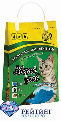 Наполнитель для туалета подойдет не только для кошек, но и грызунов и кроликов. Поэтому если вы имеете нескольких домашних питомцев, то можете использовать это средство для всех них. Гранулы размерами не превышают десяти миллиметров, что достаточно крупный размер, который не будет забиваться в щели или в межплиточное пространство. Фасуются они в мешки с ручками по три килограмма. Изготовлен он из природного сырья - древесины - поэтому биоразлагаем, не вызовет аллергической реакции, его можно смывать в канализацию. Обработан ароматизаторами «Морская свежесть», а также хорошо поглощает запахи. Кроме того, обладает и антибактериальными свойствами, что важно, если дома есть маленькие дети, постоянно контактирующие с домашними животными. Также он не пылит и не прилипает к шерсти и лапам питомцев, поэтому не будет разноситься по всей квартире или дому. Покупатели оставляют положительные отзывы о товаре. Хвалят его за нейтрализацию запахов, большие размеры гранул. Отмечают, что он нравится котам.