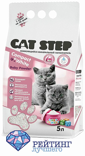 Бренд Cat Step имеет в своей линейке наполнителей Compact White Baby Powder, который можно использовать в лотке для котят. Производитель утверждает, что одной упаковки на пять литров хватит на тридцать дней при наличии одного любимца, на пятнадцать дней при двух, и на восемь при трех. Тонкий аромат детской присыпки совсем ненавязчив. Природный минерал, входящий в состав, блокирует неприятный запах выделяющегося аммиака ввиду наличия пор. При намокании он образует супер-крепкий комок, который удобно убирать, и который не пачкает лапки зверят. По этой причине он расходуется медленно. Минерал для производства наполнителя добывают в северной части Турции, не обрабатывают химикатами, только термически обрабатывают и очищают от пыли в несколько стадий, поэтому не будет пачкать лапки котят. Натуральное происхождение частиц из белой бентонитовой глины, размер которых 0,6 – 1,7 мм оптимален для котят, не вызовет аллергических реакций у зверят и людей. Производитель рекомендует со своим продуктом применять лоток с высокими стенками без сетки, куда помещать до пяти – семи сантиметров поглощающего слоя и убирать твердые отходы регулярно в мусорное ведро, досыпая вместо них новую порцию. Заметим, что его нельзя утилизировать в канализацию. Фасуется в пластиковые пакеты массой 4,2 кг, сверху имеются отверстия для удобной переноски. Покупатели оставляют положительные отзывы о товаре. Хвалят его за хорошие комки, маленький расход и впитываемость. Некоторые отмечают, что он все же липнет к лапам и разносится домашними животными по дому.