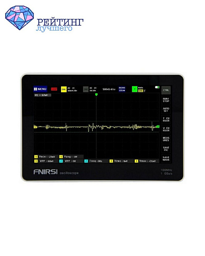 В том случае, если для вас важным критерием при выборе осциллографа выступает его мобильность и автономность, советуем присмотреться к прибору, занимающему первое место в нашем рейтинге. Благодаря высоким характеристикам функциональности, современная модель от производителя FNIRSI отлично подходит как для бытовых работ, так и для научно-исследовательской деятельности. Частота дискретизации прибора – до 500 МВыб/с. Диапазон полосы пропускания находится в значениях 0-200 кГц. Показатели входного напряжения зависят от режима полосы пропускания. При соотношении 1:1 входное напряжение составляет 50 Vpp. Соотношение же 10:1 приводит к повышению значения напряжения до 400 Vpp. Осциллограф оснащён цветным дисплеем с подсветкой. Габариты модели – 180х125х30 мм. В прибор встроен модуль защиты, позволяющий безопасно работать как при непрерывном, так и при пиковом напряжении. Несколько различных режимов запуска позволят вам проводить измерения аналоговых и цифровых сигналов. Глубина памяти устройства равна 64 Кб, что делает возможным сохранять до 2000 изображений колебательных сигналов.