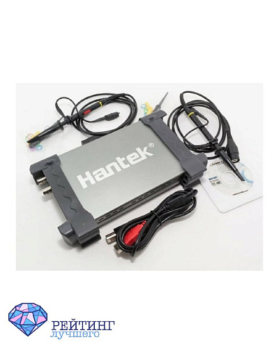 Цифровой прибор известного производителя Hantek имеет два канала, его полоса пропускания составляет 200 МГц. В наличии несколько значений скорости оцифровки в зависимости от выбранного вами режима. В одноканальном режиме частота дискретизации инструмента составляет 1 Гвыб/с., в двухканальном режиме – 500 Мвыб/с. Глубина памяти этого осциллографа тоже зависит от количества каналов. С одним каналом этот параметр равен 40 Кб, с двумя каналами – 20 Кб. Показатель входного напряжения – 300 Vpp. Преимущество этой модели заключается в достаточно большом размере дисплея (7 дюймов с разрешением 800х480). Неоспоримым плюсом является наличие у устройства порта USB.