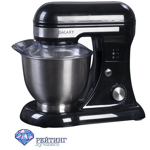 На втором месте расположился планетарный миксер GALAXY GL2230. Модель поставляется в двух цветах – черный и белый. Включает в себя дежу объемом 4 л, выполненную из нержавеющей стали. Что позволяет смешивать в ней горячие компоненты. В комплекте идет с пластиковой защитной крышкой. Мощность модели 700 Вт. У миксера 12 скоростных режимов и турбо режим. Переключатель скоростей обеспечивает плавное переключение режимов, что приводит к снижению риска разбрызгивания смеси. Благодаря трем насадкам, легко справляется с приготовлением различных блюд. Производитель гарантирует низкий уровень шума.