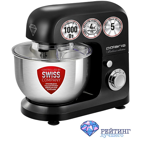 Далее по списку встречается миксер стандартной комплектации, представленный производителем Polaris. Техника Polaris производится на самых современных заводах в Китае, поэтому модель имеет надежную конструкцию с шестерней и защиту двигателя от перегрева. Все партии проходят строгий контроль качества на производстве. Мощность PKM 1002 – 1000 Вт. Корпус выполнен из пластика черного цвета. Объем чаши 4 л. Материал – нержавеющая сталь. В комплекте с чашей идет защитная поверхность с окном для добавления ингредиентов. У миксера 5 скоростей режимов работы. С помощью насадки венчик, миксер с легкостью приготовит густой крем, стабильный белок, взобьет сливки. Polaris PKM 1002 гарантировано замешает дрожжевое и слоеное тесто с помощью насадки крюка, а благодаря насадке лопатки, замешает пюре и начинку для пирога.