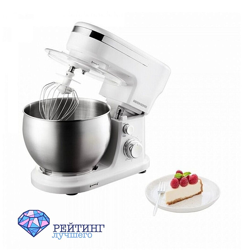 Каждая партия китайской продукции Kitfort проходит строгий контроль качества. На пятом месте - модель планетарного миксера с мощностью 800 Вт. Представлена в трех вариантах цвета - черный, белый и красный. Производители предлагают плавное регулирование скорости (8 скоростей работы) и одновременное вращение насадки по всему объему емкости и вокруг своей оси. Поэтому вы сможете легко подобрать оптимальный режим для взбивания яиц, сливок, либо для замешивания теста – жидкого или вязкого, а также смешаются абсолютно все продукты, не оставаясь у бортов чаши. Есть дополнительный импульсивный режим для переработки твердых продуктов. Особенность миксера – автоматическое отключение спустя 10 минут непрерывной работы. Комплект состоит из миксера, чаши (объем 5 л) из нержавеющей стали, три насадки (венчик для взбивания, крюк для замеса крутого теста, насадка для смешивания и приготовления пюре), крышка на чашу с загрузочным отверстием. Благодаря отверстию в защитной крышке, возможно добавлять компоненты во время работы. Кроме этого, в комплект входит сепаратор для яиц и лопатка. Корпус миксера выполнен из пластика. Вес 4.4 кг.