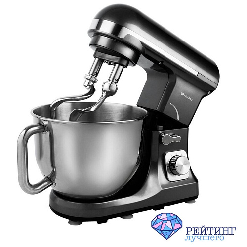 Открывает наш рейтинг - ультрасовременный планетарный миксер Kitfort KT-1343, который представлен в кофейном, светло-голубом и черном цветах на выбор. Мощность миксера 1000 Вт. Чаша выполнена из нержавеющей стали. Имеет эргономичную ручку для удобства брать одной рукой. Объем чаши 5 л. В дополнение к трем стандартным насадкам (венчик, битер для смешивания, насадка крюк) идет дополнительный крюк из сплава алюминия. Цельнометаллический венчик предоставлен для взбивания яиц и сливок. Битер используют для замеса песочного теста. Но этим функции насадки не ограничены. Её используют для приготовления пюре, соусов, густых кремов, глазури. Особенностью миксера является возможность одновременного использования двух насадок-крюков. Это дает всестороннее смешивание ингредиентов по всему охвату в чаше. Таким образом, миксер эффективно замешает дрожжевое тесто. Благодаря присоскам на основании помощник легко фиксируется на столе и не ёрзает во время работы.