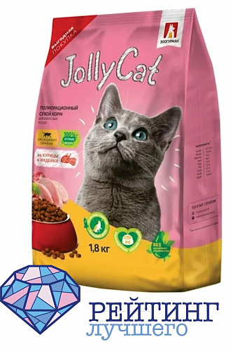 Зоогурман – одна из ведущих российских компаний, работающая в среде зоотоваров более десяти лет. Бренд Зоогурман в линейке еды для котов имеет сухой корм премиум класса Jolly Cat. Он представляет собой полнорационное питание, которое подходит для ежедневного кормления взрослых котов возрастом от года и до шести лет. Состоит он из стопроцентных натуральных ингредиентов, без добавления консервантов, искусственных красителей и ароматизаторов. Ваша кошка будет получать полноценный мясной рацион и черпать энергию из Jolly Cat каждый день. В состав входит мясо курицы и индейки, изолят белков, животный жир, комплекс витаминов и минералов. Для большего насыщения добавлена цельнозерновая пшеница и пшеничные отруби. Рецептура разработана для обеспечения кота всеми необходимыми витаминами и микроэлементами в нужных количествах для здоровья и хорошего самочувствия. В пачке содержится 1,8 килограммов подушечек для вашего любимого питомца. Покупатели в основном оставляют положительные отзывы о товаре. Хвалят его за хороший вкус и отмечают, что коты кушают его с удовольствием. Встречаются и отзывы о категорическом отказе от продукта четвероногими гурманами.