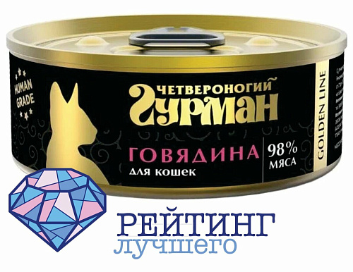 Консервы бренда Четвероногий Гурман изготавливаются из мяса и птицы категории Human Grade. Для покупки доступны одна баночка, упаковка из десяти или двадцати четырех баночек. Готовят их из частей говяжьей туши, которые практически лишены жира, например, лопатка, филейные края. За счет наличия свежего мяса в составе, ваш питомец будет получать такие важные вещества, как витамины группы В, железо, фосфор, кальций. Сохранность всех этих полезных веществ обеспечивается применением специальной щадящей технологии обработки. Для здоровья хрящей и суставов пушистых гурманов в рецептуру добавили коллаген и эластин. Качество производимого корма под контролем, производство его идет по новейшей технологии с использованием оборудования последнего поколения. Производитель не включает в свою продукцию сою и ароматизаторы. Добавление полпроцента натурального желатирующего агента нужно для недопущения образования жидкости в банке. Корм создан для котиков старше одного года, но не больше шести лет. В него не включаются зерновые культуры, по текстуре представляет собой кусочки в желе, упаковывается в банку. Рекомендованная порция составляет тридцать – пятьдесят граммов на один килограмм веса питомца, при этом норму советует разделить на два кормления. Не рекомендуют угощать кошку охлажденным или подогретым – оптимальная подача это при комнатной температуре. Покупатели оставляют положительные отзывы о товаре. Отмечают, что внутри выглядит как обычная тушенка без добавления соли, по качеству лучше, чем продающаяся для питания людей. Указывают, что коты кушают продукт, поэтому рекомендуют к покупке, хоть он и стал дороговат.