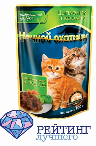 Молодой организм нуждается в большем количестве питательных и полезных веществ для роста и развития. И это справедливо для всех живых существ на планете. Котятам до года нужна не только любовь и забота, но и правильное питание. Бренд Ночной охотник создает влажный корм, состоящий из мяса цыпленка и кролика. Выглядит он как кусочки в желе, фасовка каждого пауч-пакета составляет сто граммов. На верней части пауча имеются засечки для удобного открывания. Купить можно как отдельный пакетик, так и большие упаковки, содержащие 2, 10, 18, 24, 26, 34, 42, 50 и 58 штучек. Содержит питательные вещества, минералы, витамины и белки, которые так нужны развивающемуся организму. Для приготовления деликатеса берутся отборные натуральные экологически чистые мясные продукты с мясоперерабатывающих комбинатов Краснодарского и Ставропольского краев, и злаки для большей питательности. Рецептуру же разработали в институте мясной промышленности им. Горбатова, в нее не входят консерванты и искусственные красители. Покупатели оставляют в основном положительные отзывы о товаре. Отмечают, что животное кушает с удовольствием, активен и с хорошей шерстью. Однако встречаются и отзывы о том, что котику не понравился продукт, или что кушал без особого желания.