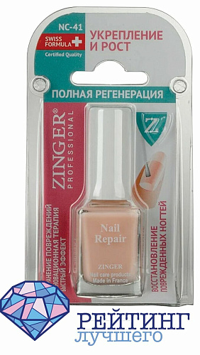 Бренд ZINGER известен своими продуктами в сфере ногтевого сервиса. Укрепляющее ногтевую пластину средство бренда ZINGER Nail Repair NC41 представляет собой привычный нам флакончик. На крышечке прикреплен аппликатор для точного и аккуратного нанесения без излишков и затеков на кожу. Обеспечение полной регенерации достигается за счет устранения повреждений и восстановления участков, которые были повреждены. Быстрый эффект достигается за счет инновационной терапии, разработанной швейцарскими учеными. Альдегиды стимулируют выработку кератина, который повышает прочность, а минеральные частицы и соединения кремния питают и увлажняют. Консистенция как у лака, при этом цвет близок к телесному, чтобы сохранять натуральный вид пальцев. При применении его как базы под маникюр нужно нанести один слой, а при отсутствии верхнего красящего покрытия – два слоя. В состав входит также фильтрующее ультрафиолет вещество, которое защитит ноготки от негативного воздействия прямых солнечных лучей. Наличие витамина Е способствует увлажнению, а еще это известный антиоксидант. Растительные масла и экстракты регенерируют, обеззараживают и обезвреживают свободные радикалы. Средство проявляет себя в борьбе со старением, и способствует регенерации. Покупательницы оставляют положительные отзывы о товаре и отмечают, что вполне довольны ZINGER Nail Repair NC41, ведь оно выполняет заявленные функции.