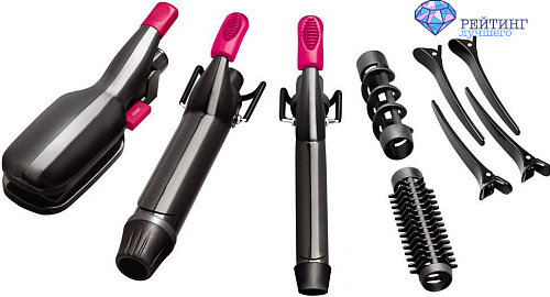 Недорогой стайлер для волос продается с богатой комплектацией, в которой предусмотрено: 4 зажима, 2 шпильки, щипцы 16 мм, щипцы 32 мм, насадка-щетка, насадка-гофре, насадка для выпрямления волос, насадка для спиральной укладки. Уникальный вариант рейтинга имеет высокую мощность, прекрасно подойдет для домашнего использования, будет прекрасным подарком маме, жене и дочери. Хорошо справляется с большими нагрузками, идеально сушит и завивает волосы, включая самые тонкие и ослабленные. Вы можете самостоятельно настраивать температуру и время нагрева для создания легкой волны или красивой оформленной укладки. Стоит недорого, поэтому так любим многими девушками и женщинами. Комплектуется футляром для удобного хранения и бережной транспортировки.