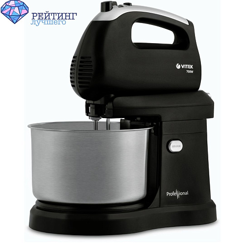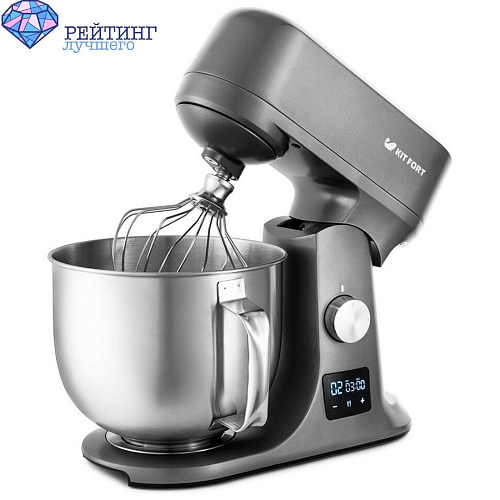 2. Стационарный - это бытовой тестомес для дома. Имеет основание с чашей, над которой нависает миксер. В комбинированных моделях верхняя часть снимается, и мы получаем ручную версию прибора. Благодаря такой конструкции вам не нужно корпеть над тестом самостоятельно, достаточно просто нажать кнопку. Кроме большей мощности, у такого тестомеса есть много возможностей за счёт разнообразных аксессуаров, идущих в комплекте. Габариты и вес у комбинированных тестомесов больше чем у ручных, но их удобно хранить, потому что они разборные. По скоростным режимам обычно не отличаются от ручных, всё те же 5 режимов + турбо.