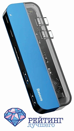 В нашем списке еще одна модель бренда Baseus, которая также отличается стильным оформлением и не останется незамеченной на рабочем столе. Корпус изготовлен из алюминиевого сплава и полупрозрачного полимера на основе поликарбоната. Такое оформление позволит увидеть внутренности аксессуара, что не может не заинтересовать. Коннекторы с покрытием из золота прослужат дольше и предотвратят появление последствий электрических и механических воздействий. Использовать ее можно только с MacBook, значительно расширяя его функционал, ведь для подключения на нем размещены два порта USB – C. Переходник станет целой станцией для периферийного оборудования из – за наличия двух выходов USB конфигурации 3,0, разъемом HDMI, и порта USB Type-C с поддержкой технологии Power Delivery, который способен зарядить быстр даже ноутбук. Наличие интерфейса HDMI сделает возможным вывод изображений или видео в разрешение 4К на экран. Подключение осуществляется в горизонтальной плоскости, все выходы расположены на таком расстоянии друг от друга, чтобы беспрепятственно подключить любое устройство, будь то флешка или внешний жесткий диск. Аксессуар можно брать с собой, ведь его размеры компактны. Покупатели поставили высокие оценки этому товару и не указали ни одного недостатка.