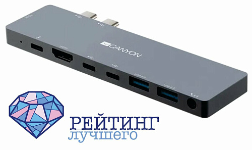 Еще один вариант для использования с MacBook в нашем рейтинге. Canyon (CNS-TDS08DG) включает в себя сразу восемь возможных соединений с периферийным оборудованием и аксессуарами. Но при этом и цена тоже повышается за счет увеличения функционала. Внешний вид весьма стандартный и минималистичный, сделан в серебристом цвете, алюминиевый корпус без лишних деталей. Все соединения пассивного разветвителя в горизонтальной плоскости. USB порты нескольких конфигураций: два А 3,0 и два USB-C со скоростью передачи данных 5 Гбит в секунду, один USB-C с поддержкой технологии Power Delivery для зарядки мощностью 87 Вт. В отличие от предыдущих вариантов, здесь имеется аудио – выход 3,5 мм, поэтому можно подключать проводные наушники для лучшего звука. Есть и возможность подключения второго монитора, причем оба будут работать без задержек. Кроме того, на них вы можете выводить изображения или видео в разрешении 4К через два порта HDMI при 30 Гц, или же в Full HD 1080P при 60 Гц. Срок службы и гарантия на два года. Покупатели оставляют положительные отзывы о товаре. Хвалят его за хорошую работоспособность, компактные размеры, наличие всех необходимых интерфейсов, надежное крепление к ноутбуку, металлический корпус и стильное оформление. Отмечают, что цена высоковата, и что при копировании информации с диска на диск при использовании двух USB гнезд хаб греется.