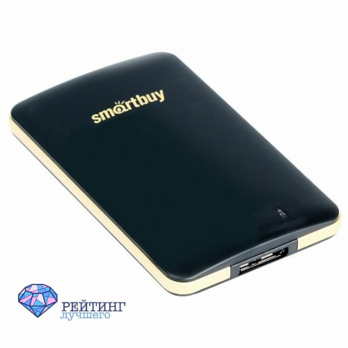 На седьмой строчке расположилась модель внешнего накопителя SSD SmartBuy S3. Поставляется с кабелями USB (3.0 Type-А и Type-C) и тканевым чехлом на затяжке. Ширина устройства – 49 мм, длина 79 мм, толщина – 9 мм. Вес накопителя 24 г. Пластиковый корпус SSD SmartBuy S3 производится в белом цвете и два варианта в черном - с золотыми гранями или серебряными. Объем накопителя – от 128 Гб до 1 ТБ. Скорость записи 400 Мб в секунду, скорость чтения 440 Мб в секунду. То есть внешний накопитель дает возможность просматривать фильм, не скачивая его предварительно на ПК. Устройство не требует установки дополнительного программного обеспечения для работы.