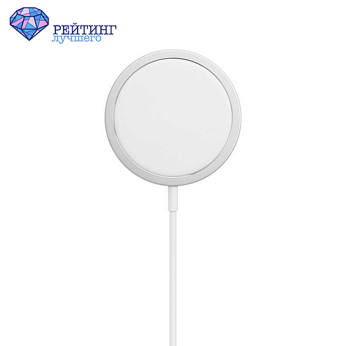 Замыкающая наш рейтинг беспроводная зарядка Apple MagSafe MHXH3ZE/A очень востребована среди пользователей. Она компактна, удобна и создана специально для iPhone 12 или iPhone 12 Pro, но также может заряжать модели новее iPhone 8. Это устройство выдает мощность 15 Вт, хорошо примагничивается к корпусу телефона и не требует снятия чехла, если его толщина не превышает 3 мм. Стоит оно, конечно, не дешево, но зато гарантирует безопасность при восполнении заряда, так как защищено от перепадов напряжения в сети и не боится перегревов.